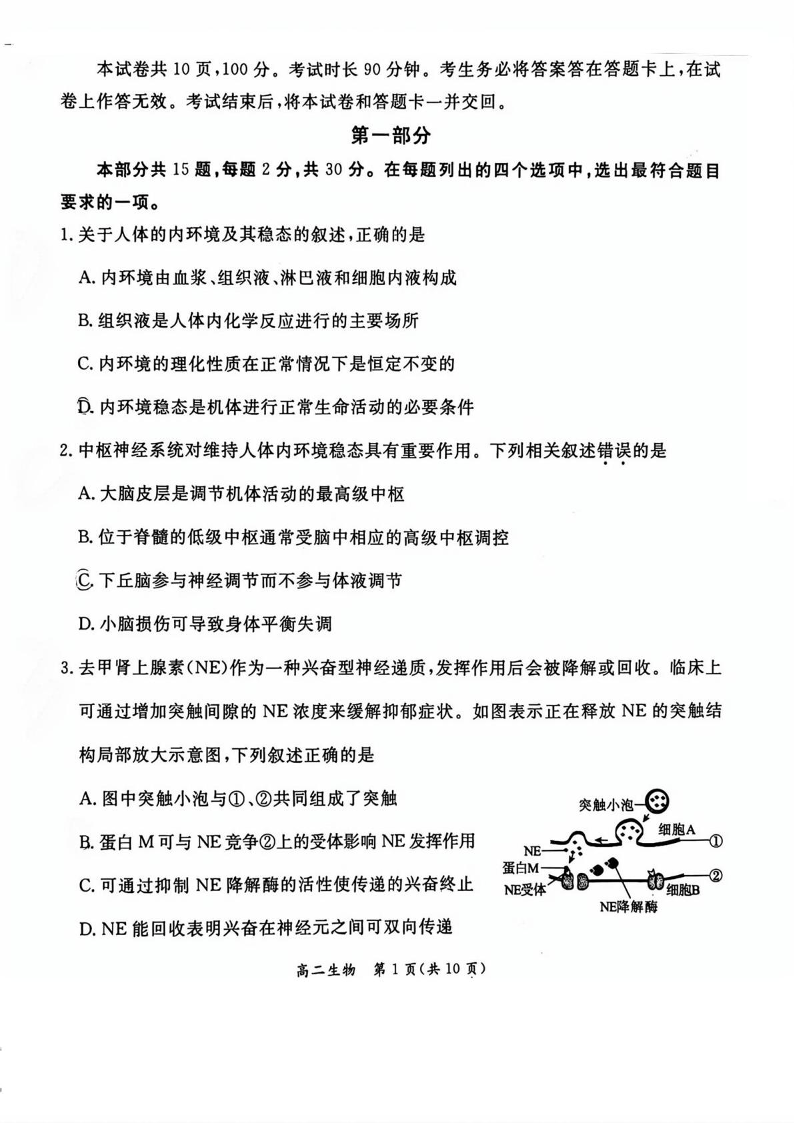 北京市东城区2024-2025学年上学期高二期末考试生物+答案