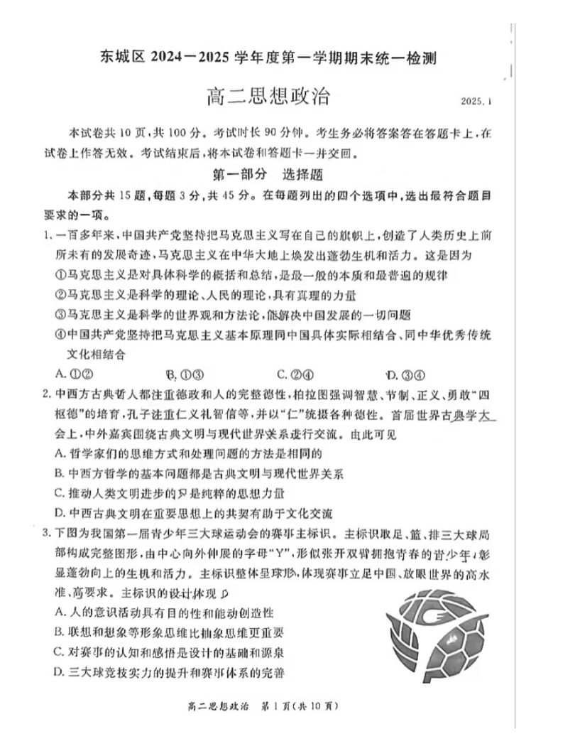 北京市东城区2024-2025学年上学期高二期末考试政治