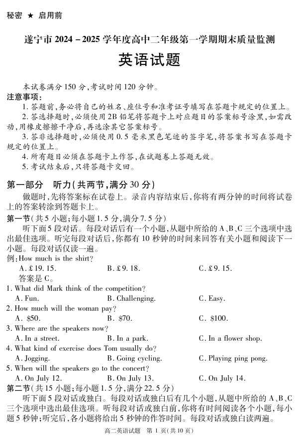 四川省自贡市、遂宁市、广安市等2024-2025学年上学期高二期末考试英语+答案