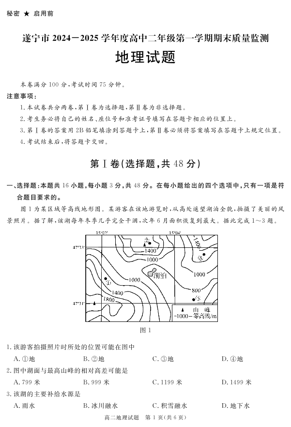 四川省自贡市、遂宁市、广安市等2024-2025学年上学期高二期末考试地理+答案