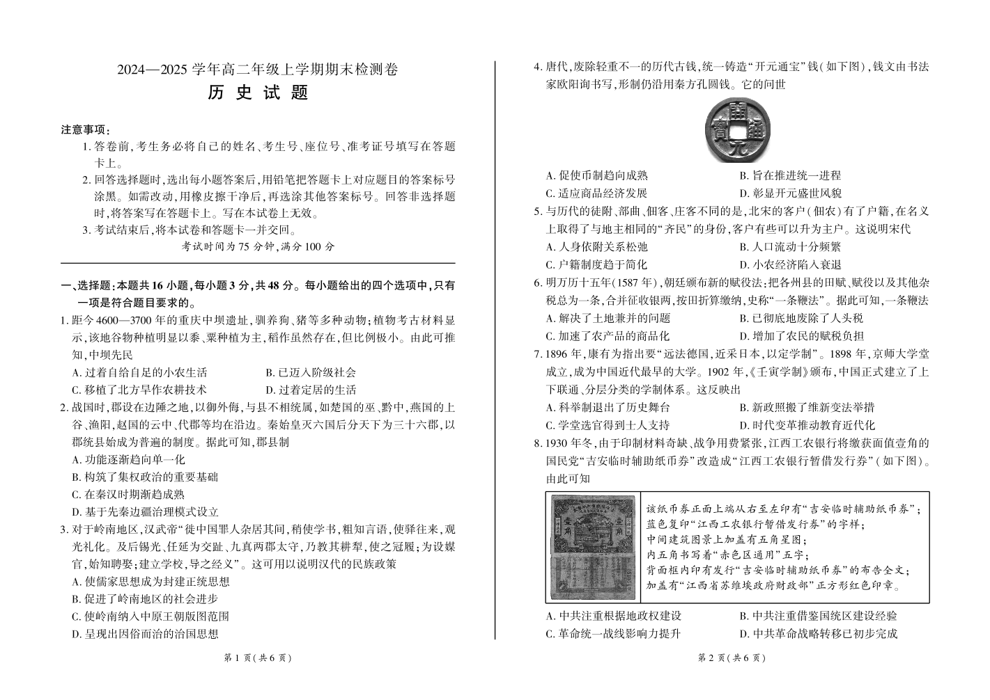 湖南省区域高中2024-2025学年上学期1月高二期末考试历史+答案
