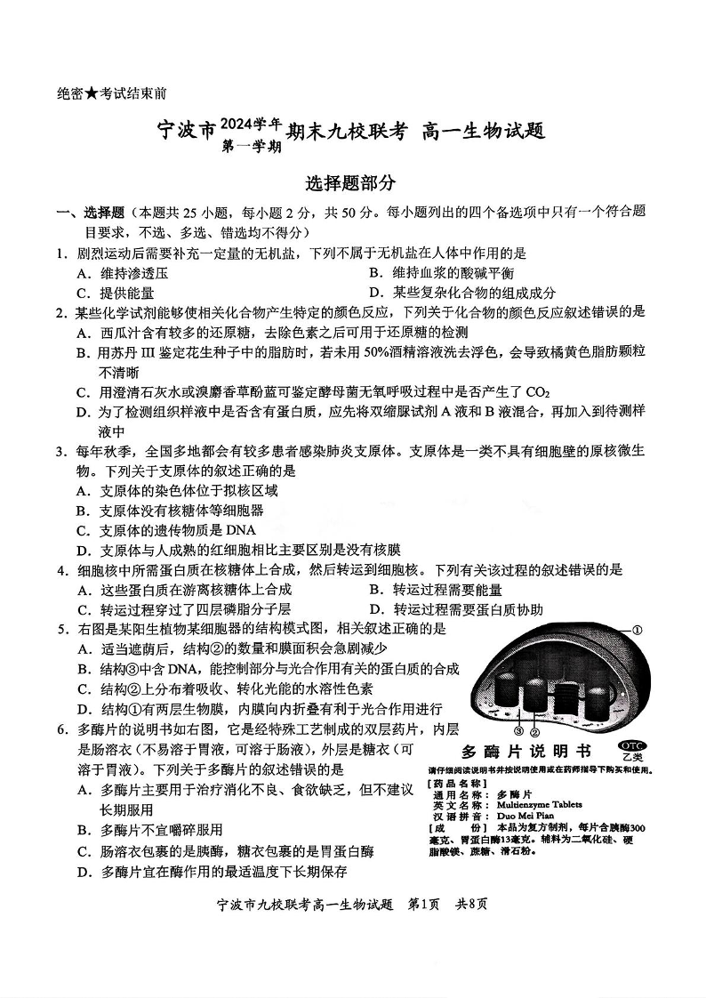 浙江省宁波市九校2024-2025学年上学期高一期末联考生物+答案