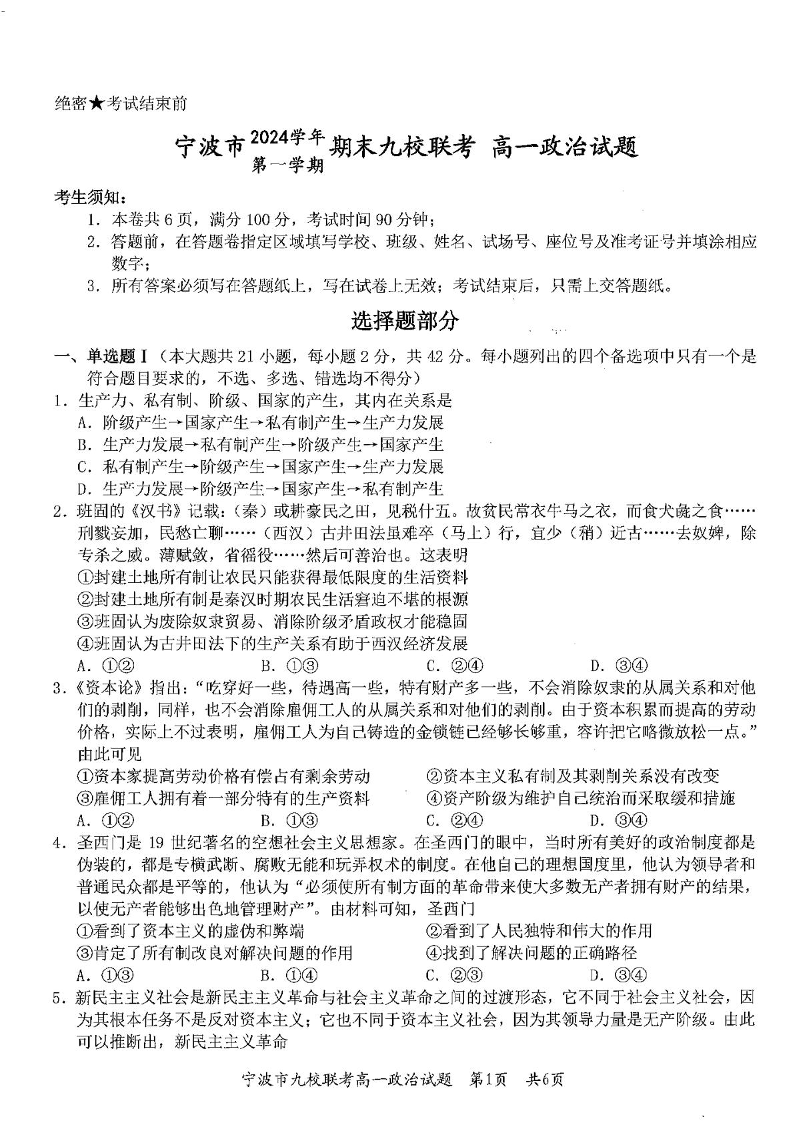 浙江省宁波市九校2024-2025学年上学期高一期末联考政治+答案