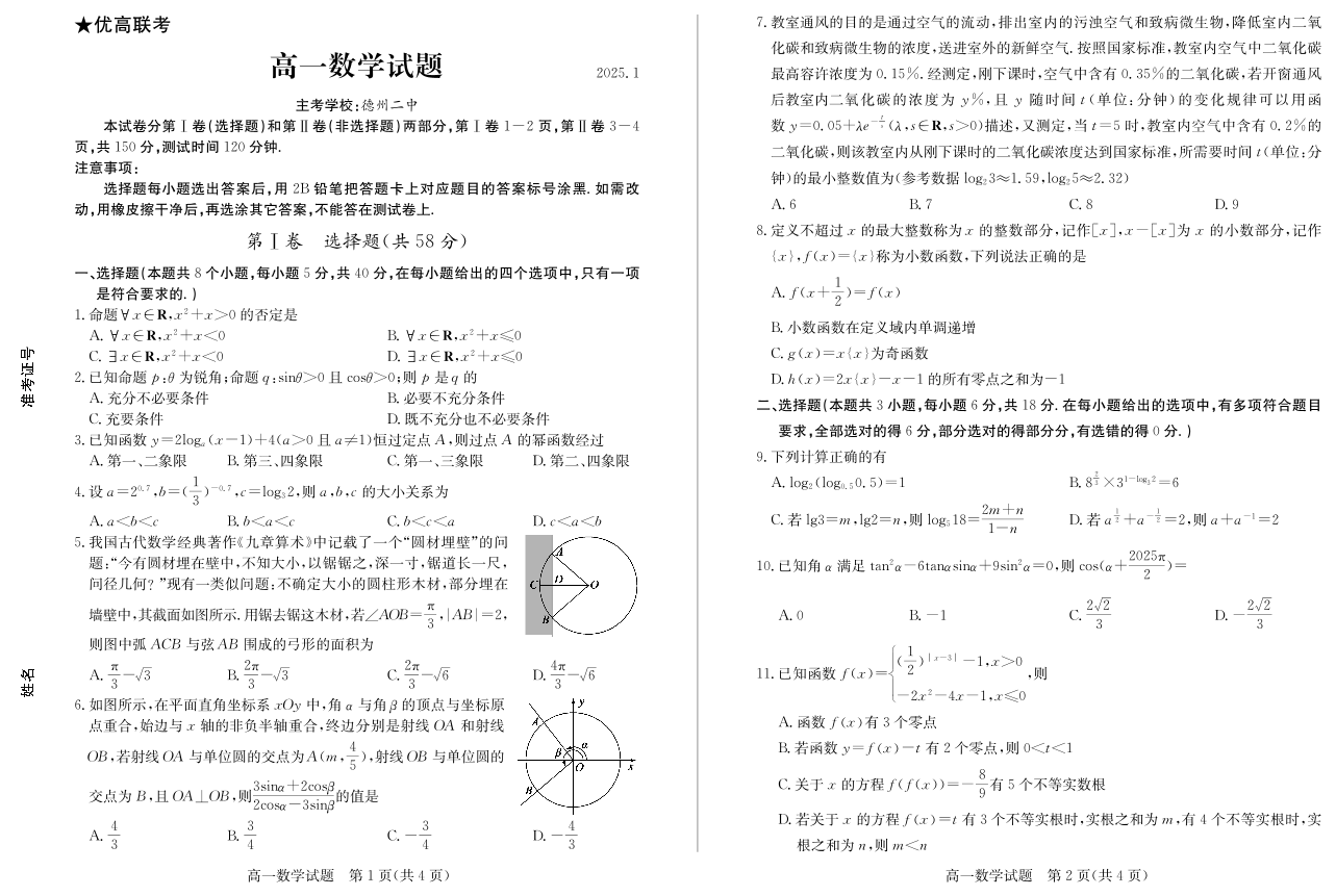 山东省德州市2024-2025学年上学期1月高一期末考试数学