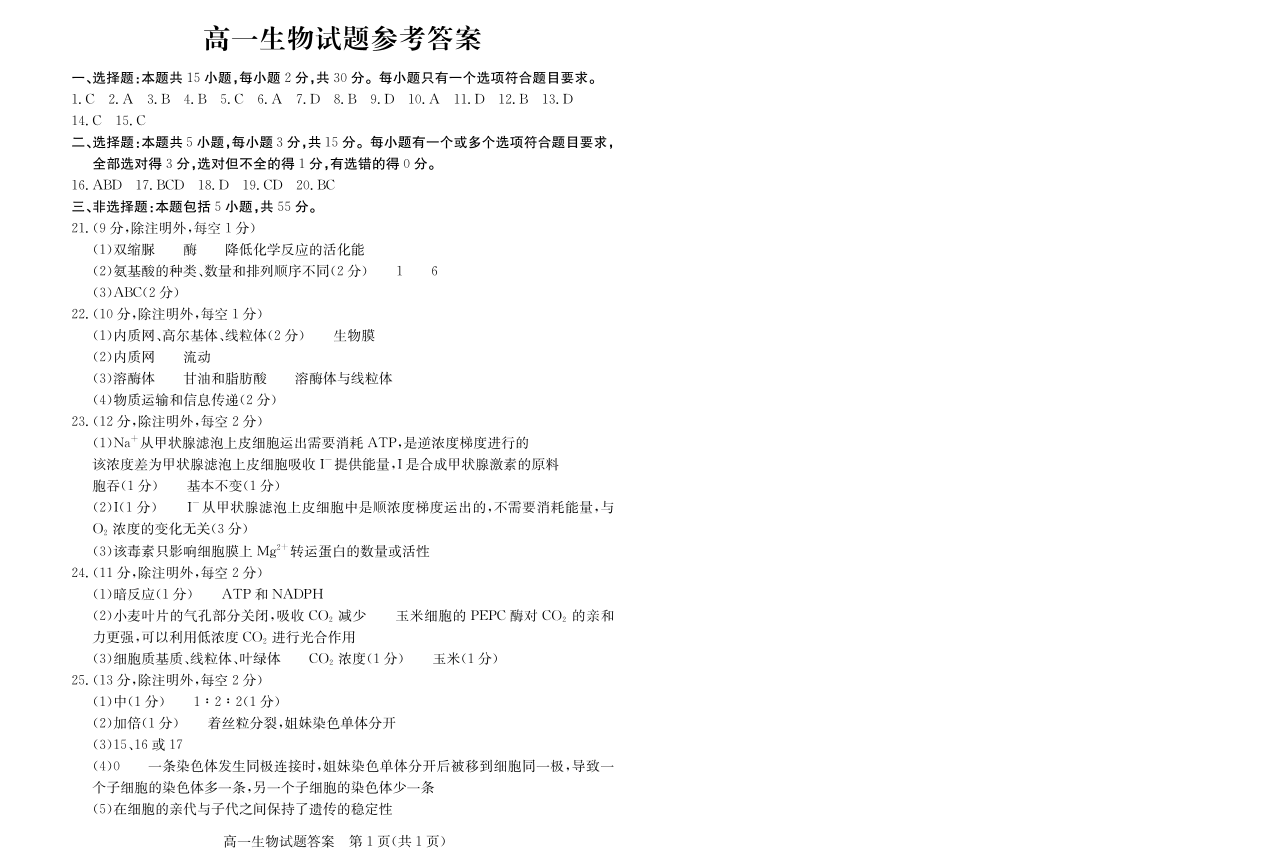 山东省德州市2024-2025学年上学期1月高一期末考试生物答案