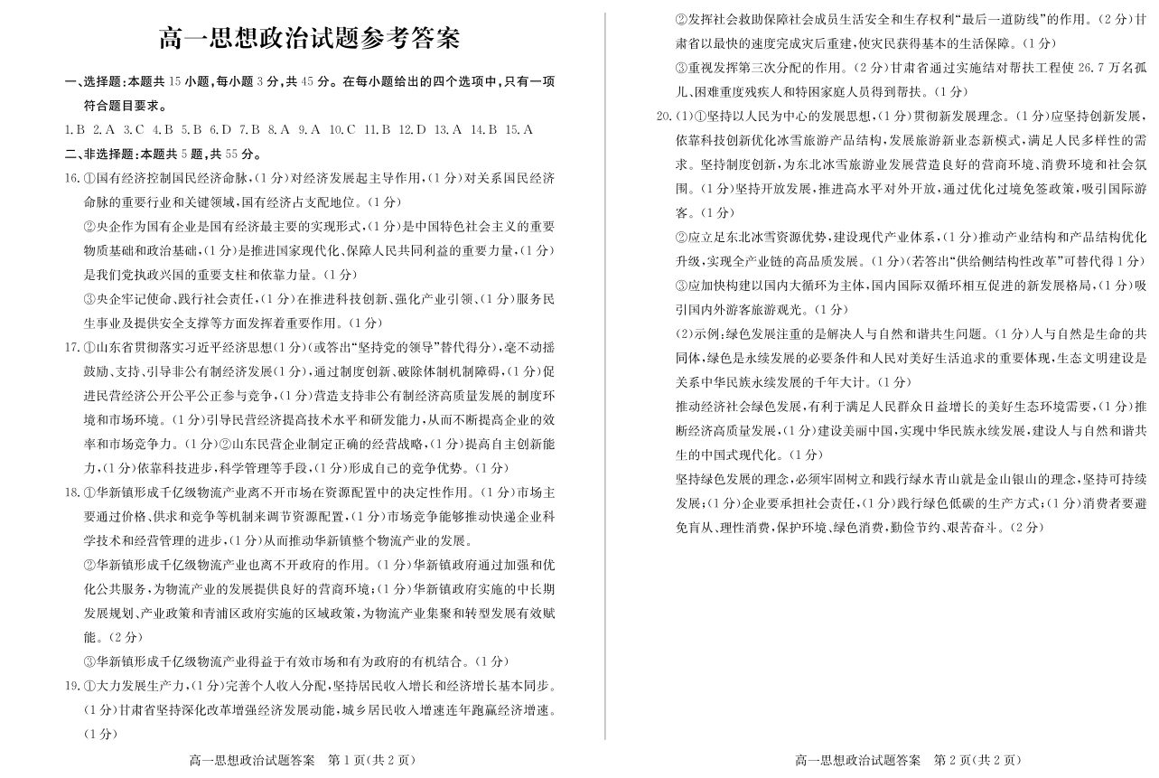 山东省德州市2024-2025学年上学期1月高一期末考试政治答案