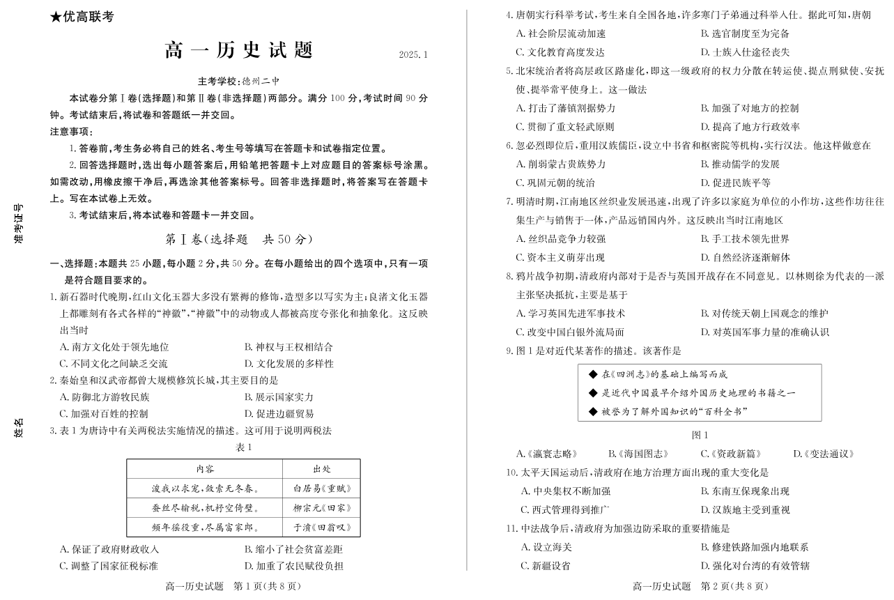 山东省德州市2024-2025学年上学期1月高一期末考试历史