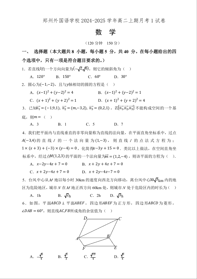 河南省郑州外国语学校2024-2025学年高二上期月考1数学+答案