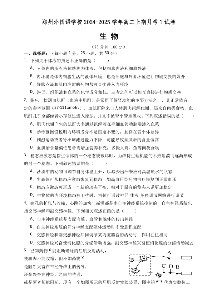 河南省郑州外国语学校2024-2025学年高二上期月考1生物+答案