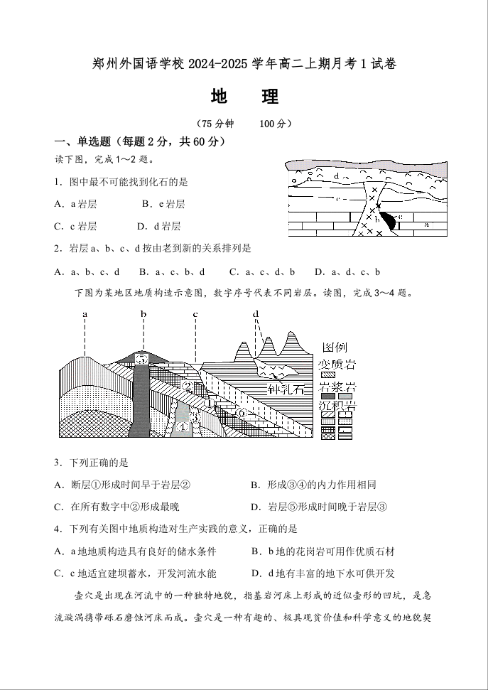 河南省郑州外国语学校2024-2025学年高二上期月考1地理 +答案