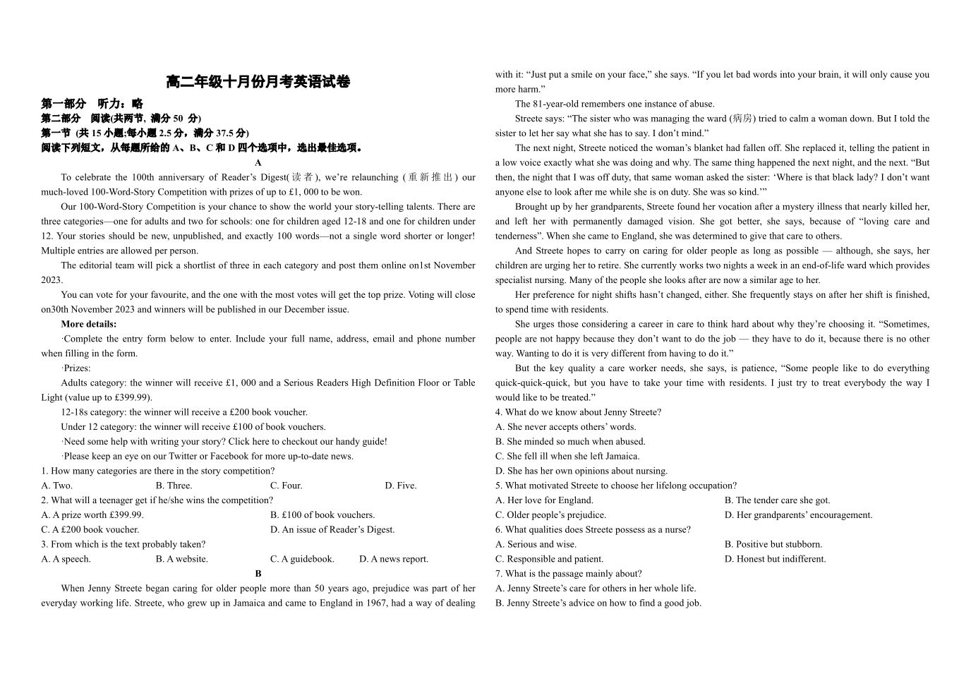 河南省开封市龙亭区2024-2025学年河南大学附属中学高二年级10月月考英语