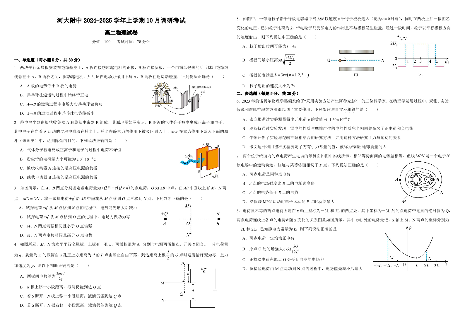 河南省开封市龙亭区2024-2025学年河南大学附属中学高二年级10月月考物理