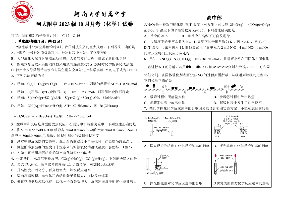 河南省开封市龙亭区2024-2025学年河南大学附属中学高二年级10月月考化学