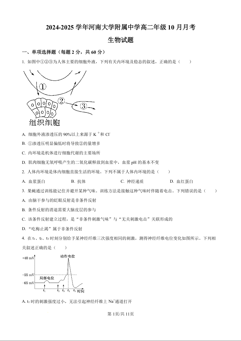 河南省开封市龙亭区2024-2025学年河南大学附属中学高二年级10月月考生物(原卷版)