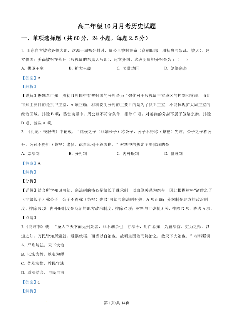 河南省开封市龙亭区2024-2025学年河南大学附属中学高二年级10月月考历史(解析版)