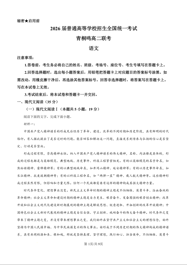 河南省青桐鸣大联考2026届普通高等学校招生全国统一考试高二联考语文(原卷版)