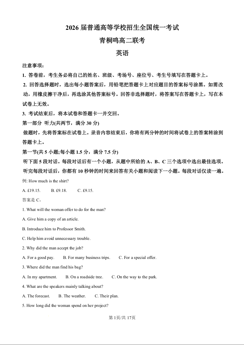 河南省青桐鸣大联考2026届普通高等学校招生全国统一考试高二联考英语+答案