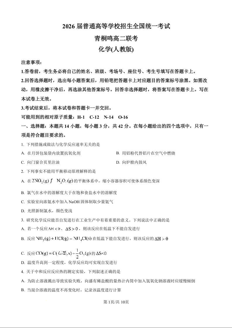 河南省青桐鸣大联考2026届普通高等学校招生全国统一考试高二联考化学(原卷版)