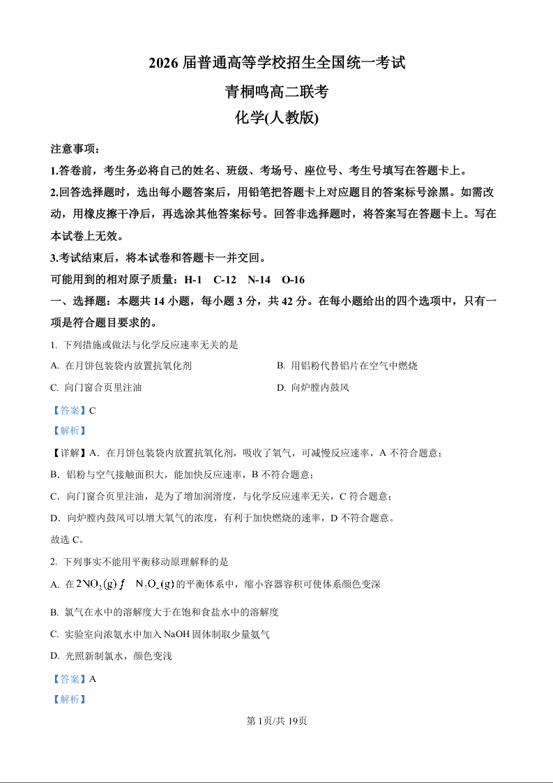 河南省青桐鸣大联考2026届普通高等学校招生全国统一考试高二联考化学(解析版)