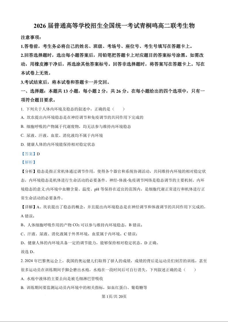 河南省青桐鸣大联考2026届普通高等学校招生全国统一考试高二联考生物(解析版)