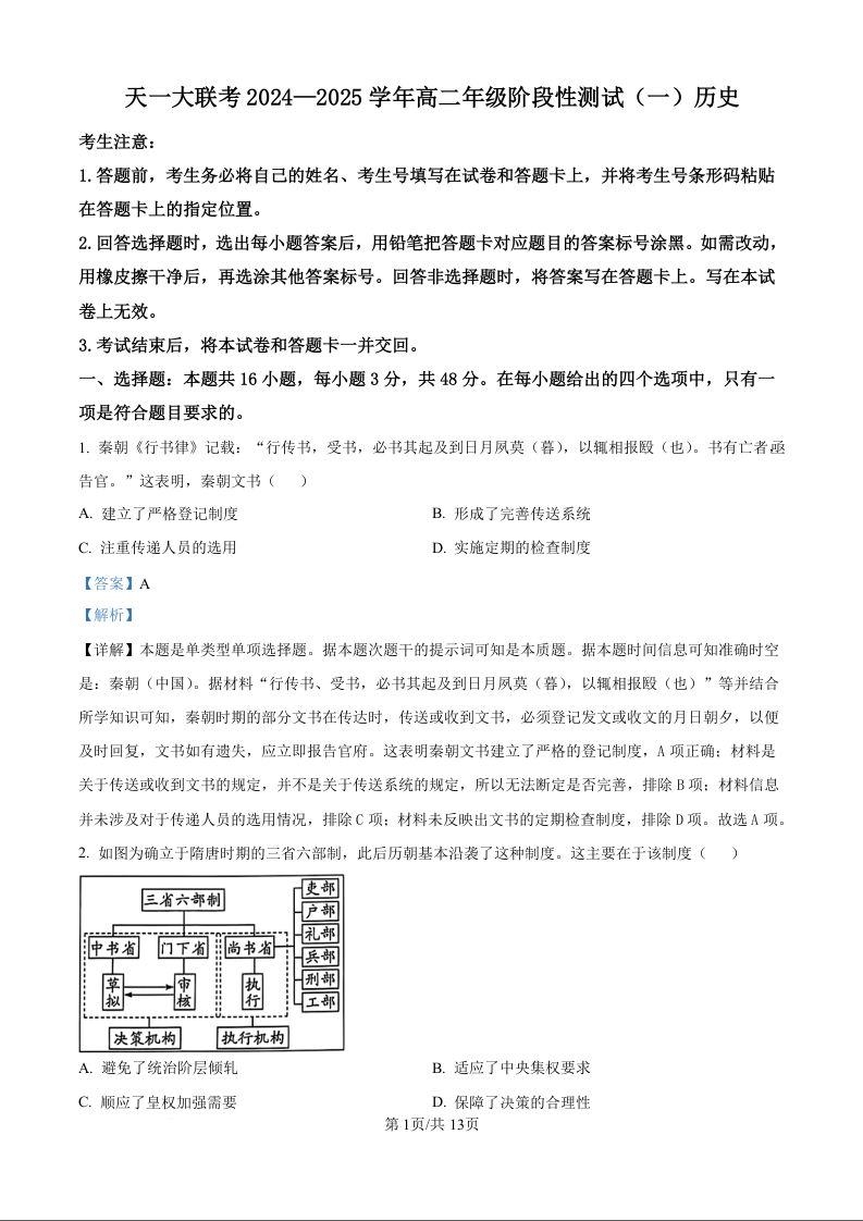 河南省周口市部分校2024—2025学年高二年级阶段性测试(一)历史(解析版)