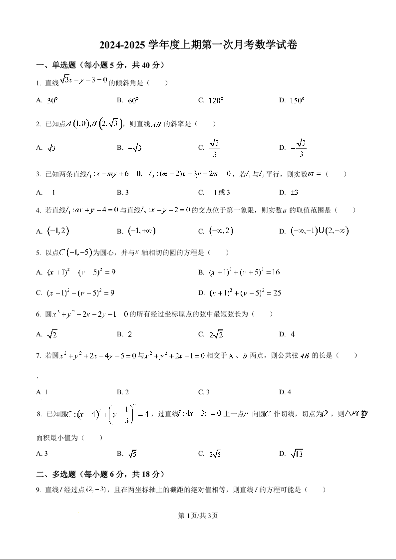 河南省驻马店市河南驻马店经济开发区2024—2025学年度上期高二第一次月考数学(A卷)(原卷版)