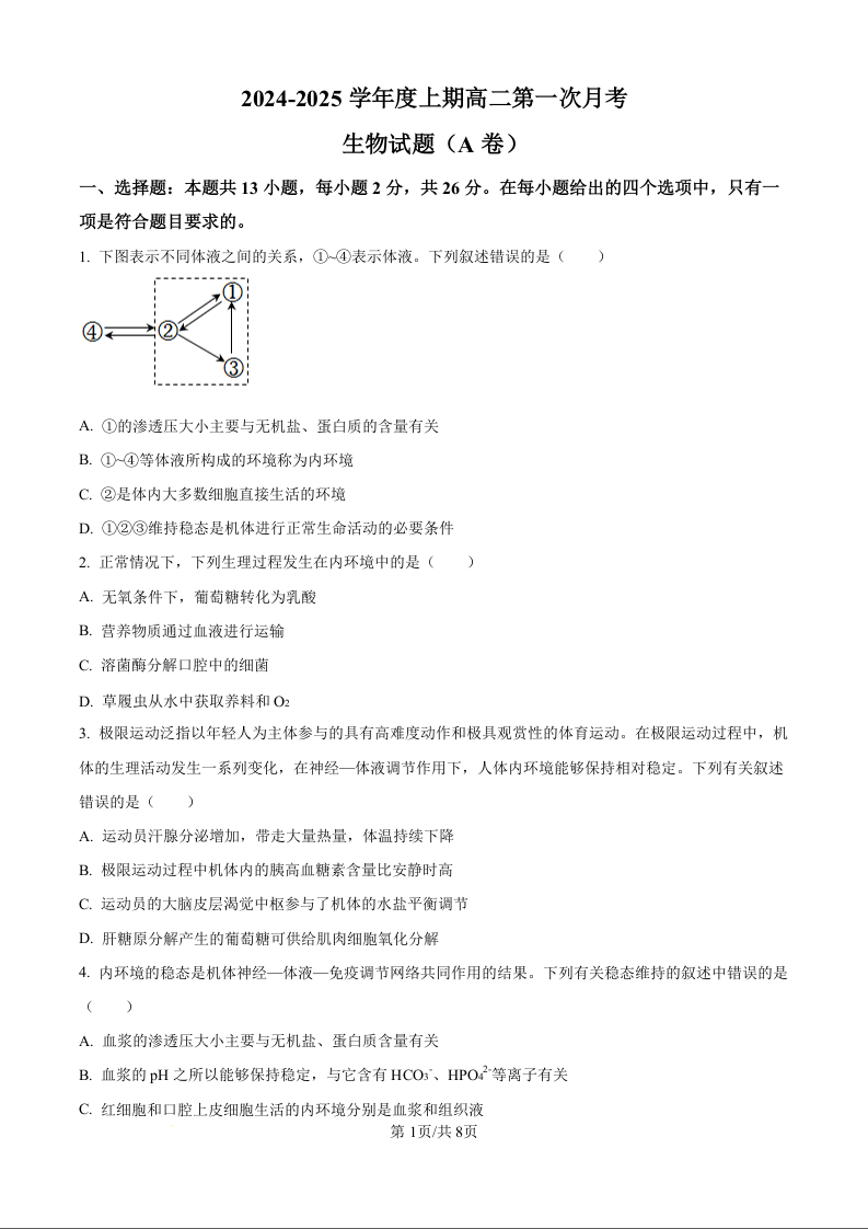 河南省驻马店市河南驻马店经济开发区2024—2025学年度上期高二第一次月考生物(原卷版)