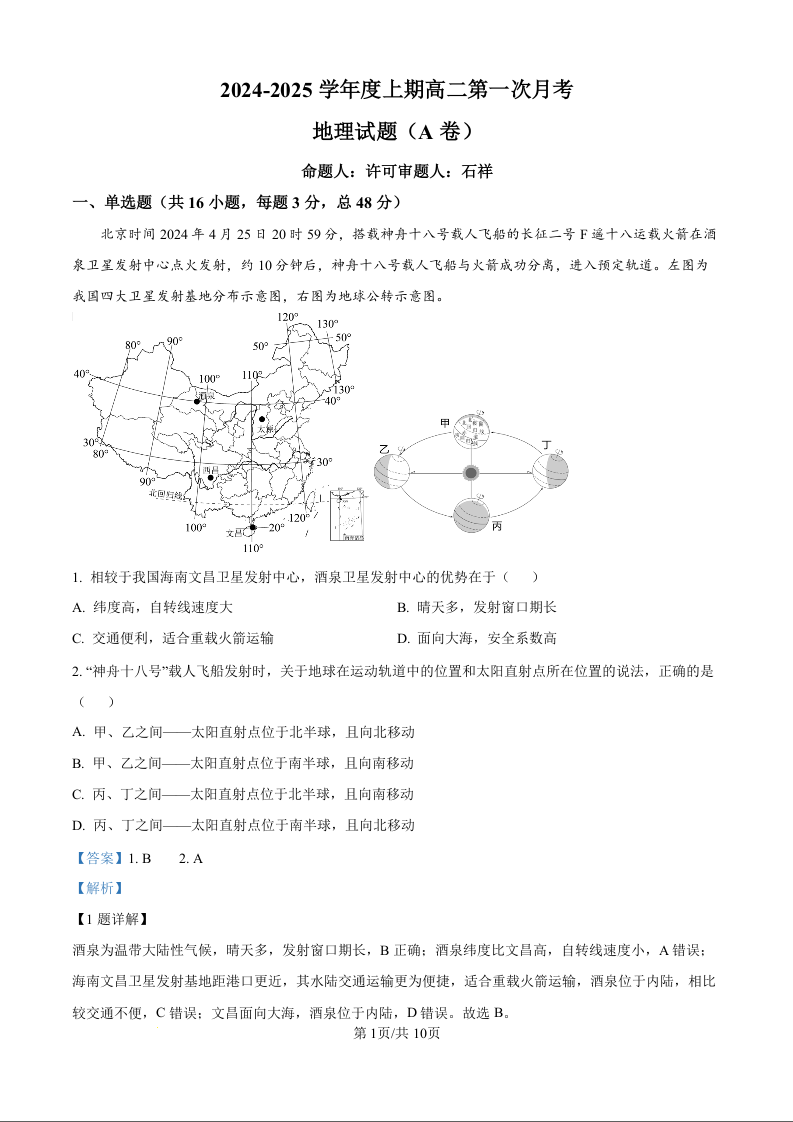 河南省驻马店市河南驻马店经济开发区2024—2025学年度上期高二第一次月考地理(解析版)