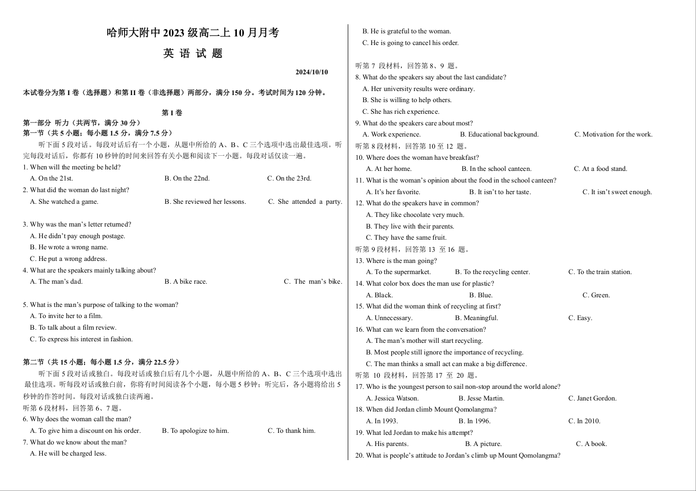 黑龙江省哈尔滨市哈师大附中2023级高二上学期十月月考英语