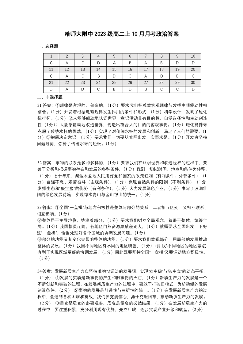 黑龙江省哈尔滨市哈师大附中2023级高二上学期十月月考政治答案