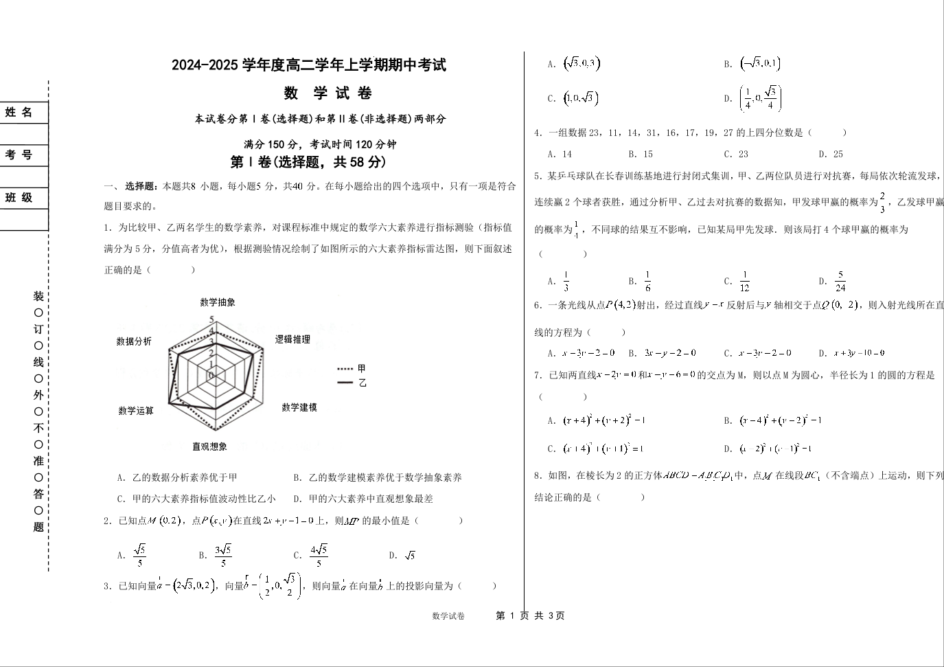 黑龙江省富锦市部分学校2024—2025学年度高二学年上学期期中考试数学