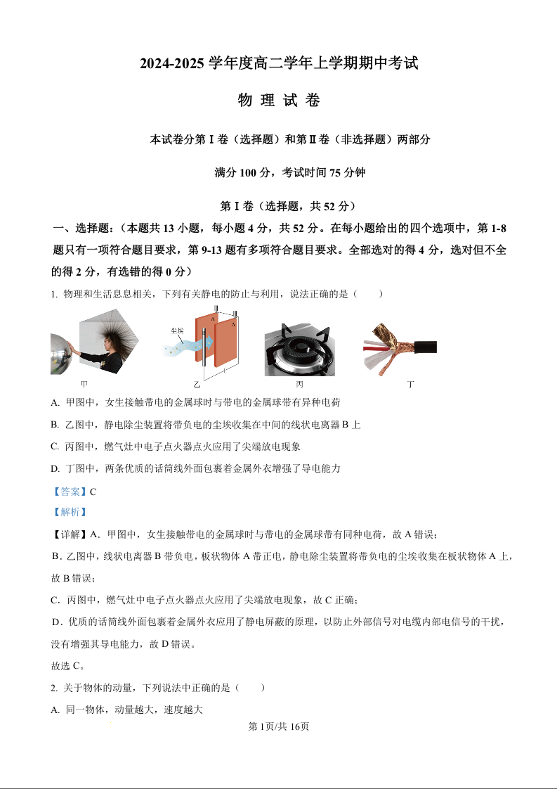 黑龙江省富锦市部分学校2024—2025学年度高二学年上学期期中考试物理(解析版)