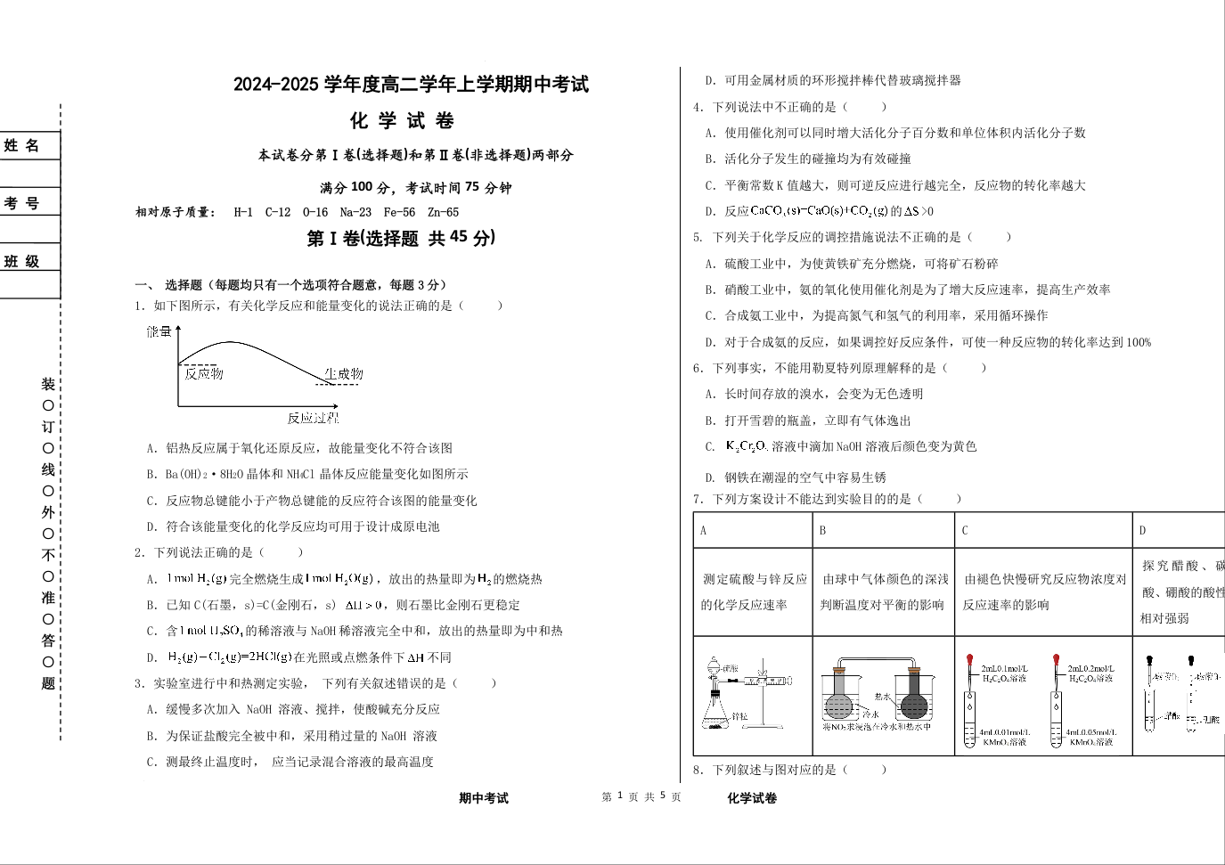 黑龙江省富锦市部分学校2024—2025学年度高二学年上学期期中考试化学