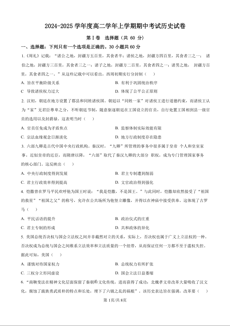 黑龙江省富锦市部分学校2024—2025学年度高二学年上学期期中考试历史(原卷版)