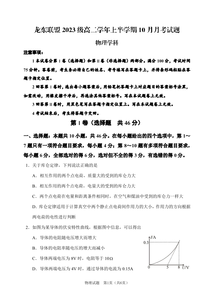 黑龙江省龙东联盟2023 级高二年级上学期 10 月月考物理