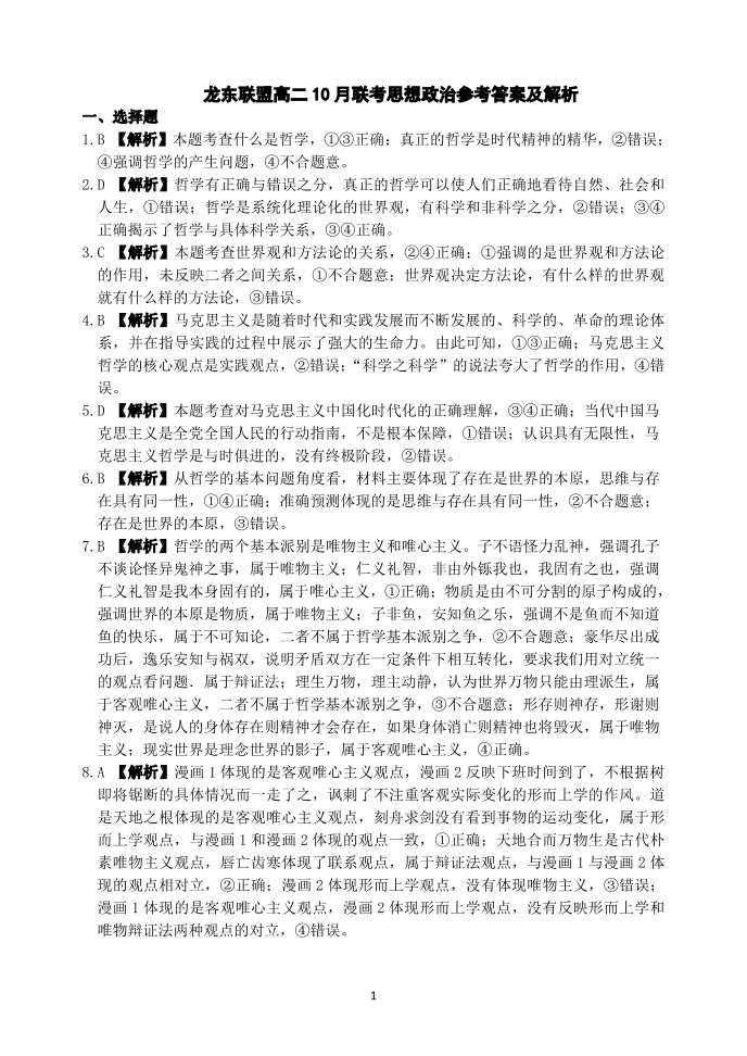 黑龙江省龙东联盟2023 级高二年级上学期 10 月月考政治答案