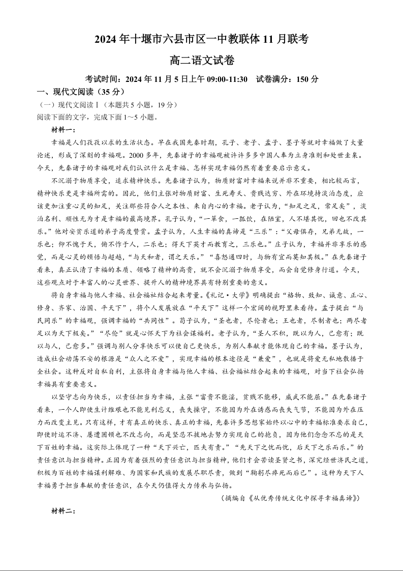湖北省2024年十堰市六县市区一中教联体11月联考语文+答案