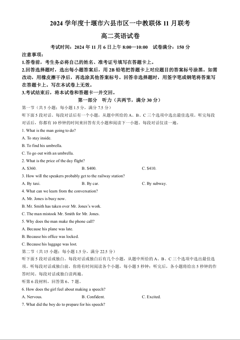 湖北省2024年十堰市六县市区一中教联体11月联考英语+答案