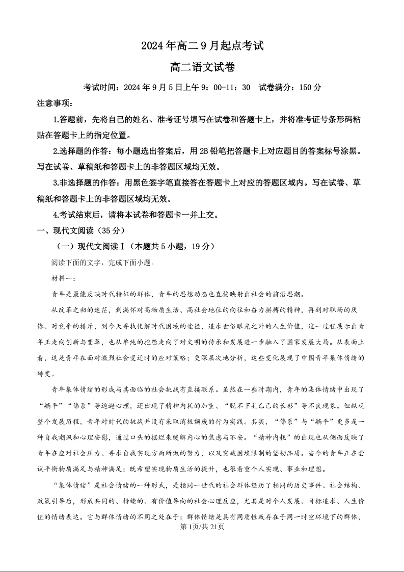 湖北省孝感市新高考联考协作体2024年高二9月起点考试语文(解析版)
