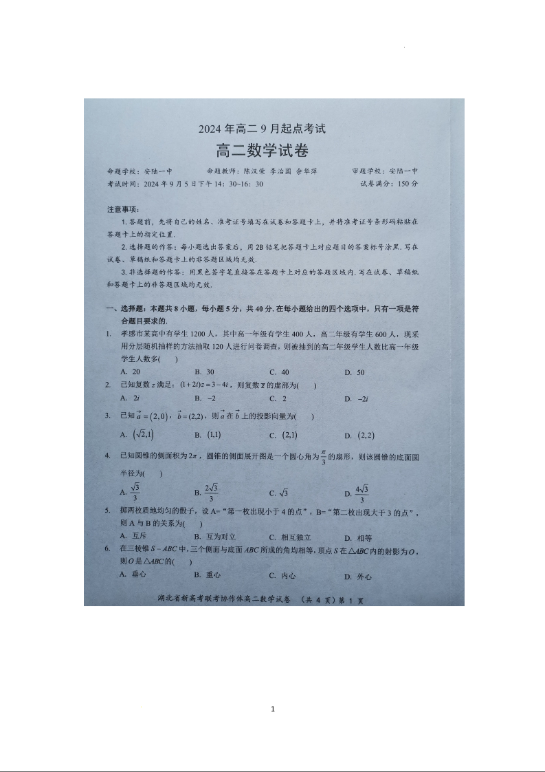 湖北省孝感市新高考联考协作体2024年高二9月起点考试数学