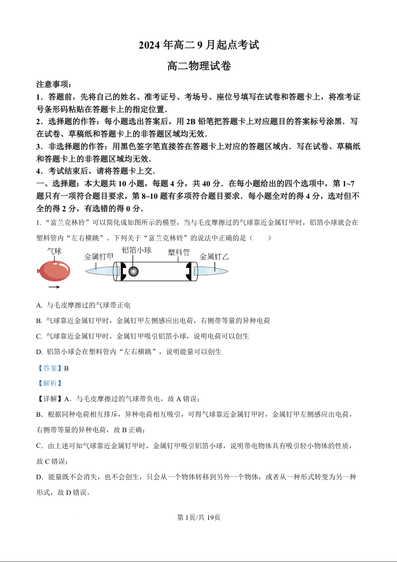 湖北省孝感市新高考联考协作体2024年高二9月起点考试物理(解析版)