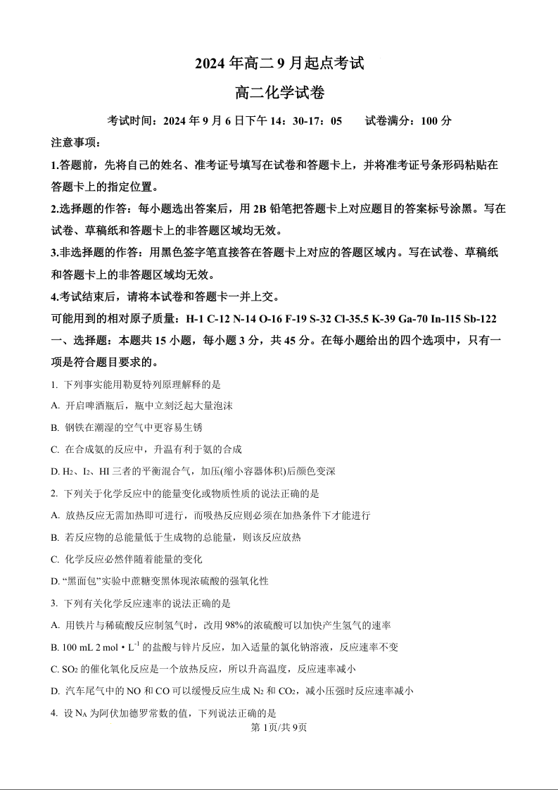 湖北省孝感市新高考联考协作体2024年高二9月起点考试化学(原卷版)