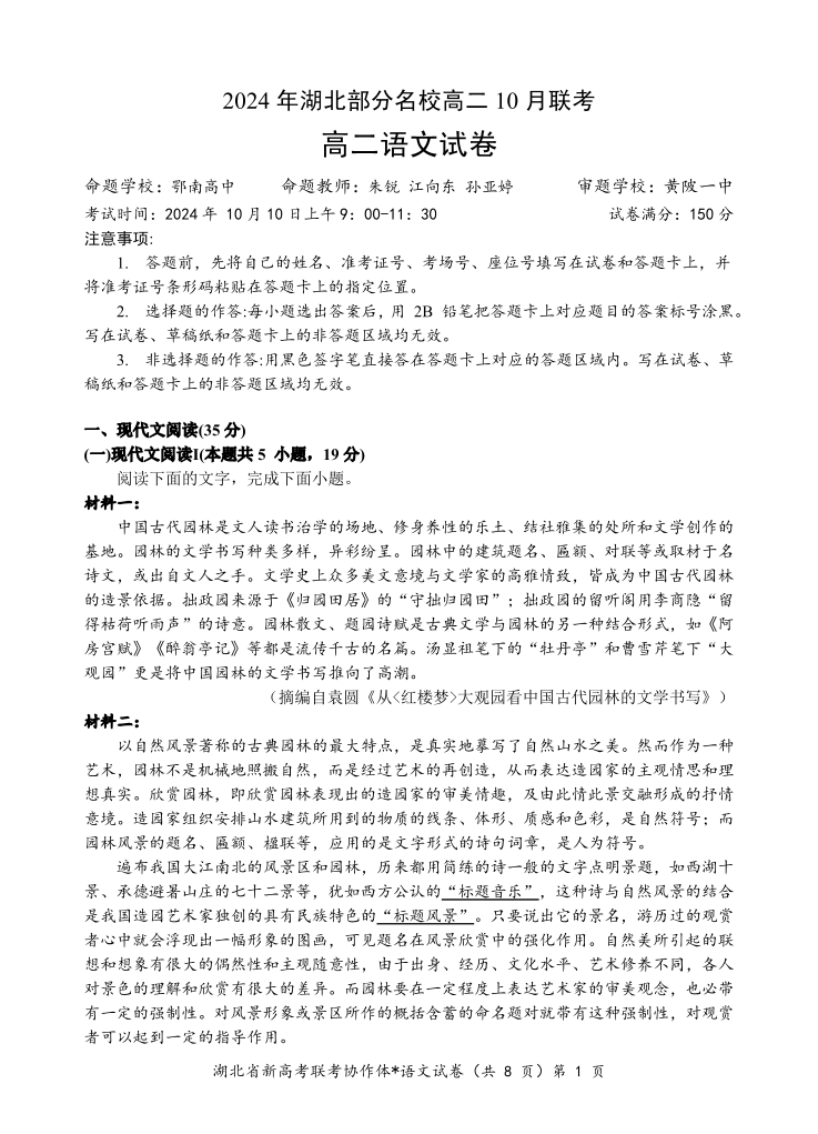 湖北省新高考联考协作体2024 年湖北部分名校高二 10 月联考语文