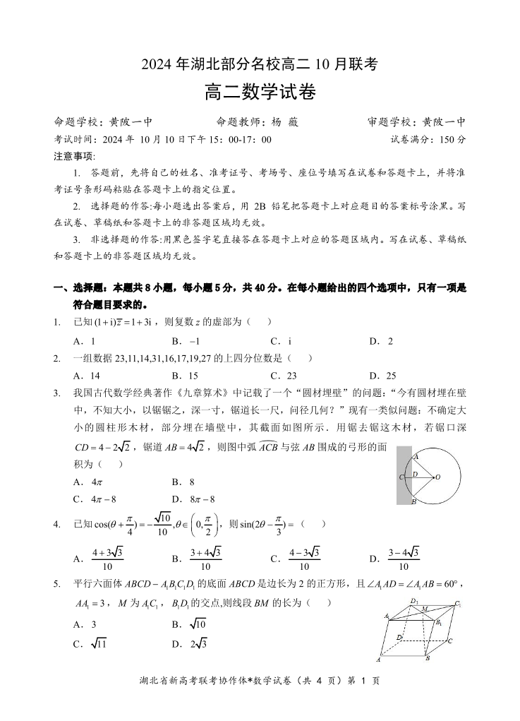 湖北省新高考联考协作体2024 年湖北部分名校高二 10 月联考数学