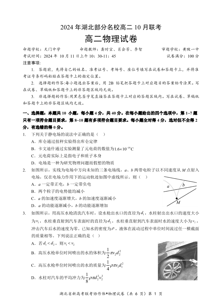湖北省新高考联考协作体2024 年湖北部分名校高二 10 月联考物理