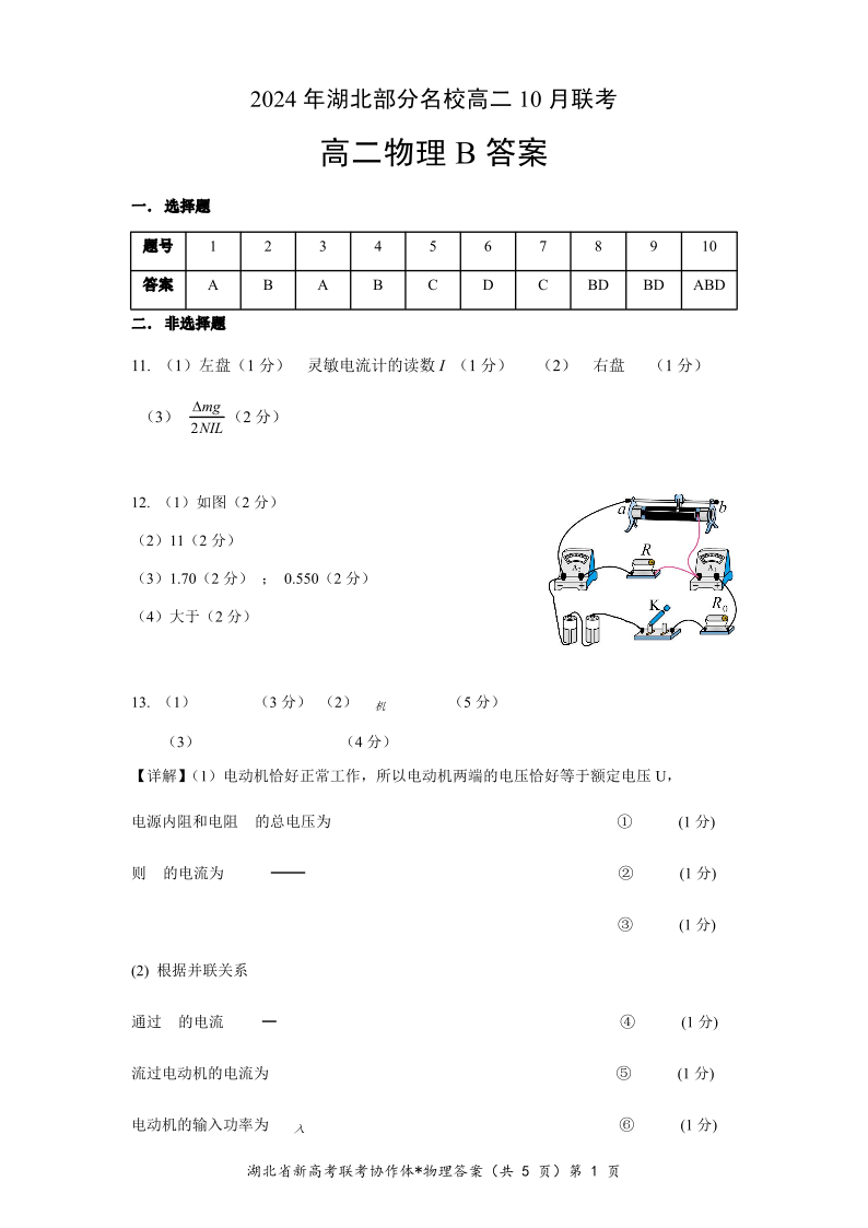 湖北省新高考联考协作体2024 年湖北部分名校高二 10 月联考物理B答案