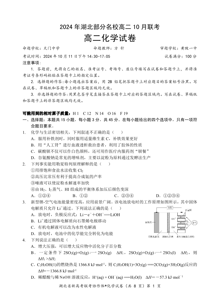 湖北省新高考联考协作体2024 年湖北部分名校高二 10 月联考化学