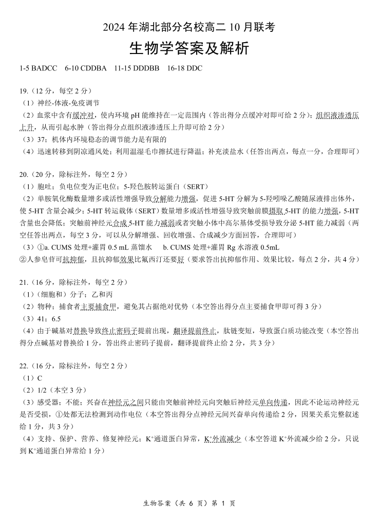 湖北省新高考联考协作体2024 年湖北部分名校高二 10 月联考生物答案