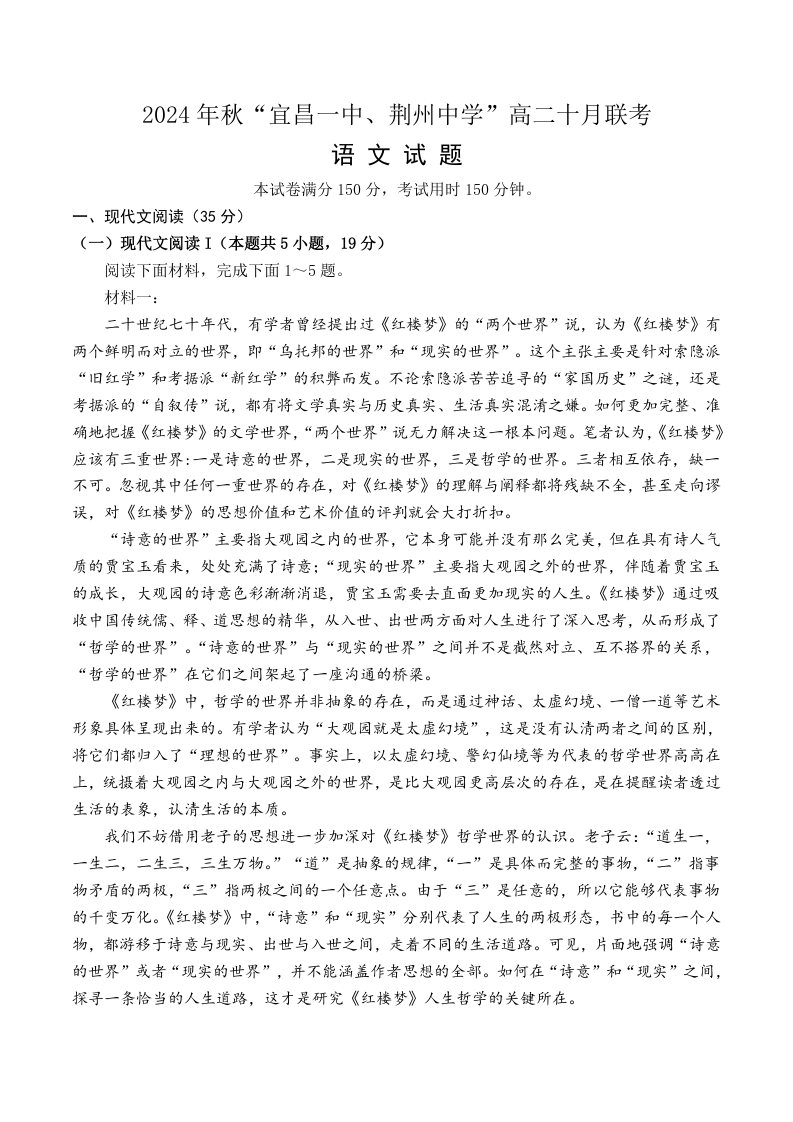 湖北省宜昌市2024年秋“宜昌一中、荆州中学”高二十月联考语文+答案