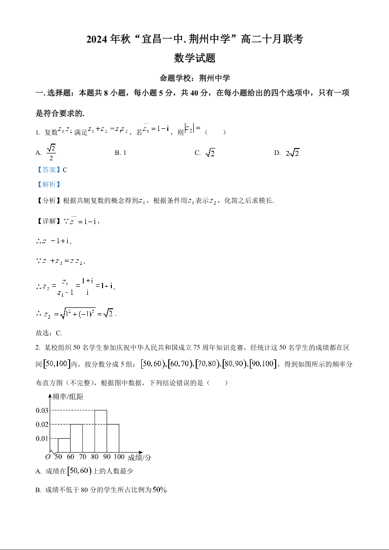 湖北省宜昌市2024年秋“宜昌一中、荆州中学”高二十月联考数学答案